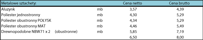 Nowością w naszej ofercie są sztachetki metalowe, produkowane są onez blachy o grubości 45 - 0,60 mm. Dzięki specjalnemu kształtowi i dodatkowym przeprofilowaniom sa bardzo sztywne. Zaletą jest doskonałe zabezpieczenie antykorozyjne warstwą ocynku oraz farby poliestrowej lub proszkowej. Sztachetki produkowane są w różnych długościach oraz w szerokiej gamie kolorystycznej. Uzupełnieniem oferty są profile Omega, mogą one służyć jako poprzeczki do zamontowania sztachetek, chociaż znajdują też inne zastosowania jak np. poprzeczki do ogrodzeń wykonanych z blach trapezowych bądź jako blaty stalowe. | ![]() |